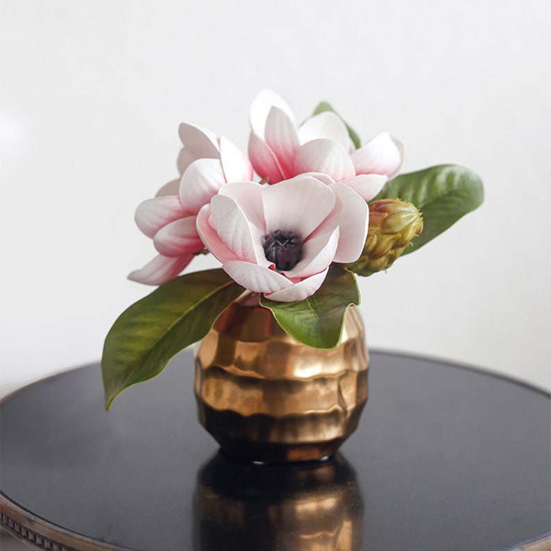 Artificial magnolias branch cream | artificial flowersnothing says luxury better than branches of pink artificial magnolias displayed simply en masse in a beautiful vase or bowl or as a single branch in a statement vase. The reality is that real flowers are always better, but fake flowers do work wonders for those times when your favorite varieties are not in season. Lots of people choose to place artificial flowers in a vase with water. Artificial magnolia spray in sphere vase. Our deluxe stem of artificial magnolias has two open flowers and a bu.